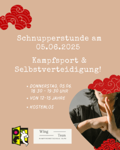 In Kooperation mit der WingTsun Schule Olpe laden wir dich herzlich zu einer Schnupperstunde im Kampfsport ein – mit besonderem Fokus auf Selbstverteidigung. Egal, ob du einfach Spaß an Bewegung hast, lernen möchtest, dich in brenzligen Situationen besser zu behaupten, oder dein Selbstvertrauen stärken willst – hier bist du genau richtig! Wenn das Training dir gefällt, besteht die Möglichkeit, daraus einen fortlaufenden Kurs entstehen zu lassen.